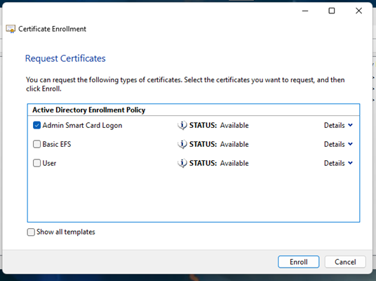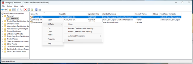 - Find the certificate with your name and with the intended purposes being Smart Card Logon.