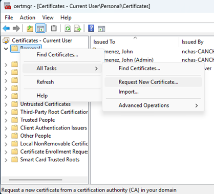 - Go to Right click personal -> All Tasks ->Request New Certificate